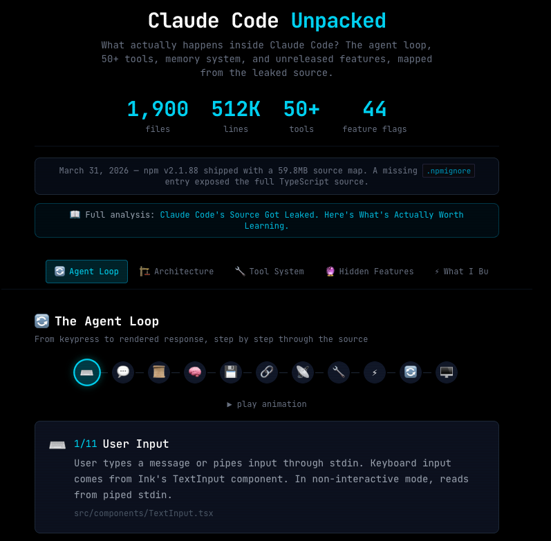 I built an interactive explorer that maps the entire agent loop, all 50+ tools, the architecture systems, and the hidden features. If you want to explore the leaked architecture visually without reading raw TypeScript, start there.