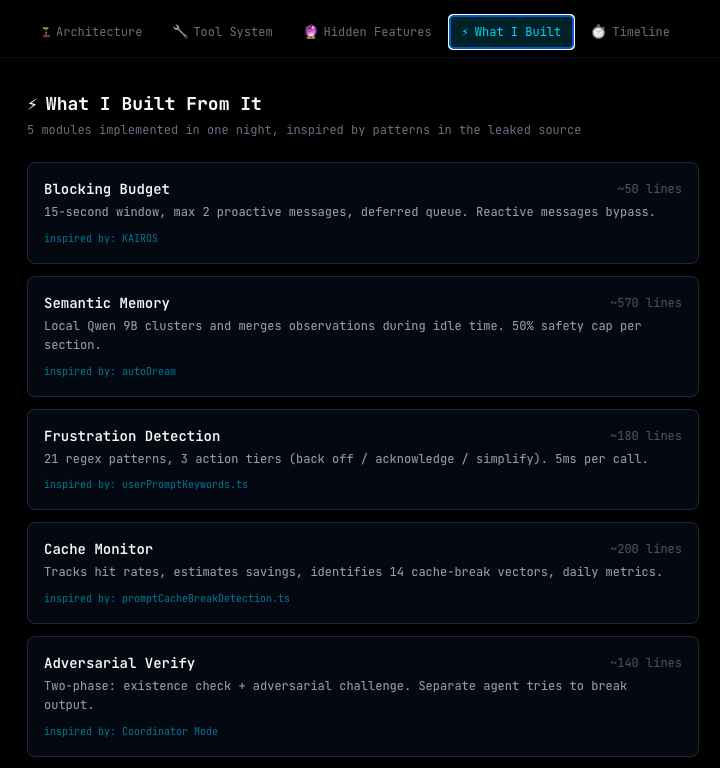 I didn’t just read the leak. I treated it as a learning exercise and built things from it. That same night, I implemented five modules inspired by patterns in the leaked source: