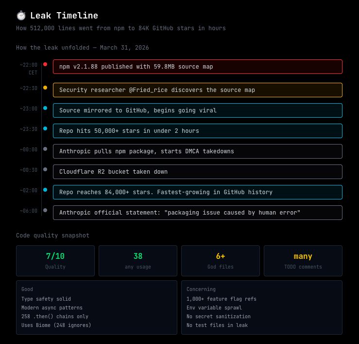 It wasn’t intentional. I know people are debating this because the timing aligns with April 1 and because Anthropic had a rough PR week (cease-and-desist against the OpenCode project). But the evidence is clear: they’ve been mass-sending DMCA takedowns to GitHub repos, they pulled the npm package, and their Cloudflare R2 bucket was taken down. You don’t do that with a planned release. The strategic roadmap exposure is too costly, especially during IPO preparation. Theo from t3.gg put it well: “if you think this was intentional, I have a couple bridges for sale.”