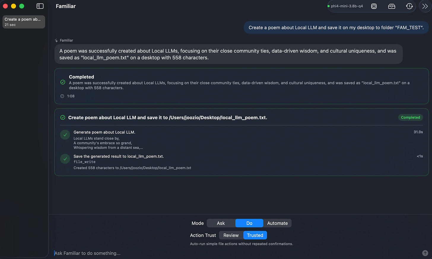 That’s fine. The goal isn’t to replace cloud AI. It’s to have something useful for the category of tasks where local is better: private, offline, no cost. For those cases, Familiar already works, and I can improve it from here.