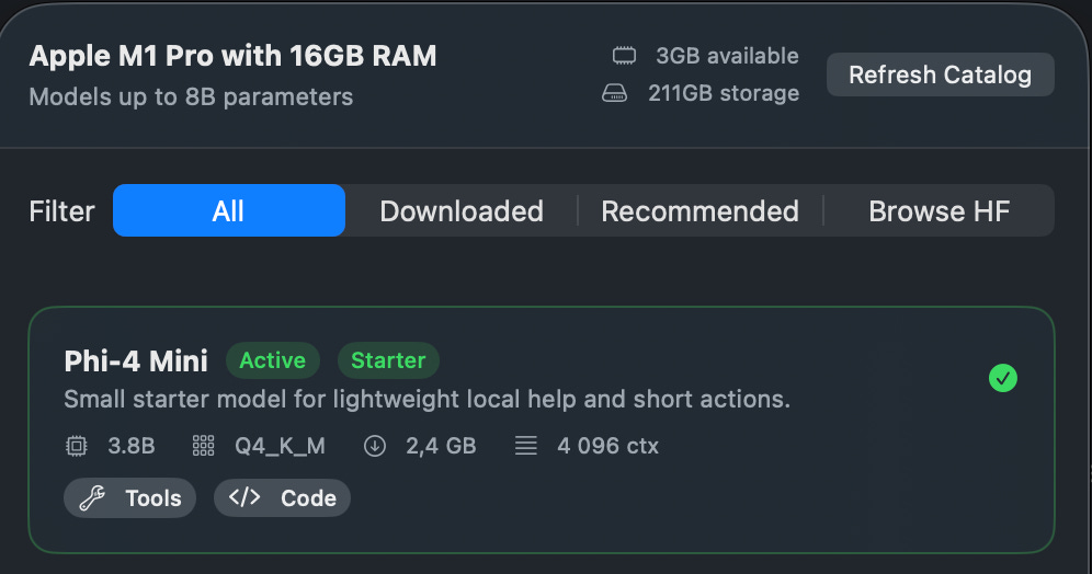 Hardware detection on first launch. The app looks at what you have (RAM, chip, available resources) and recommends the best model for your hardware. Not the most powerful model in existence. The best model you can run without your machine becoming a heater. This removes the friction of “which model do I even download?”
