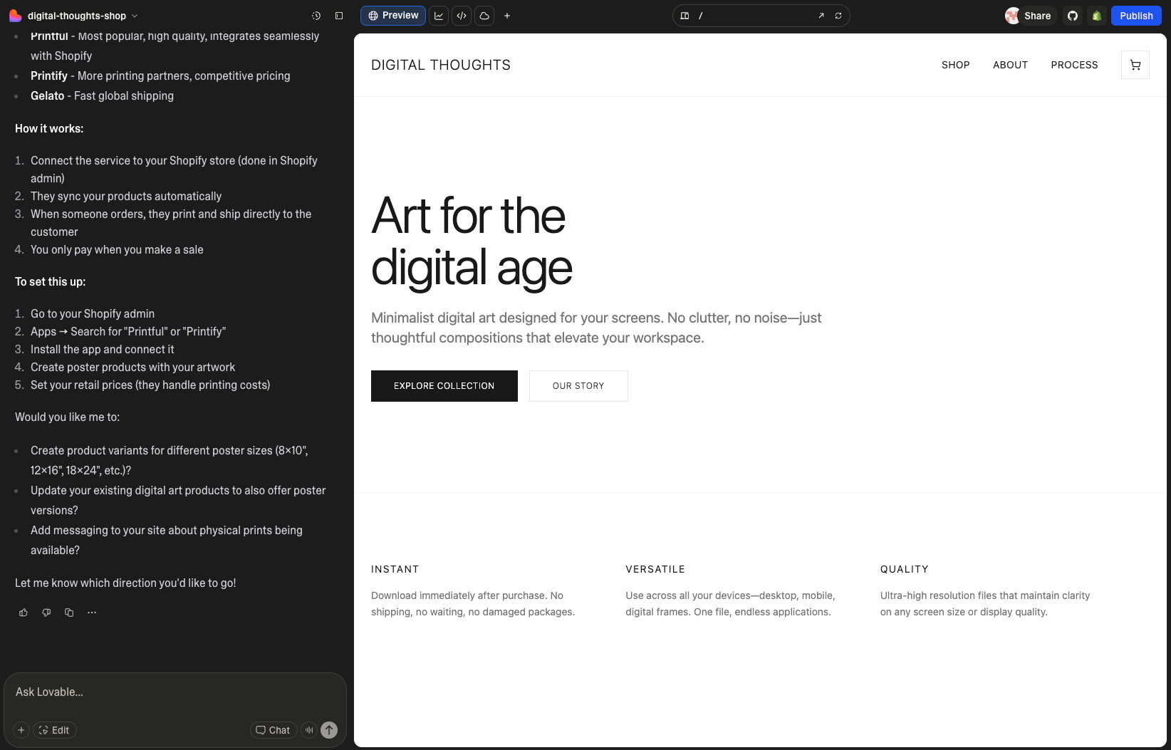 When I asked Lovable to modify my digital art products into physical posters, it couldn’t execute that change. It gave me INSTRUCTIONS on what to do in Shopify’s backend. But it couldn’t actually make the modification itself.
