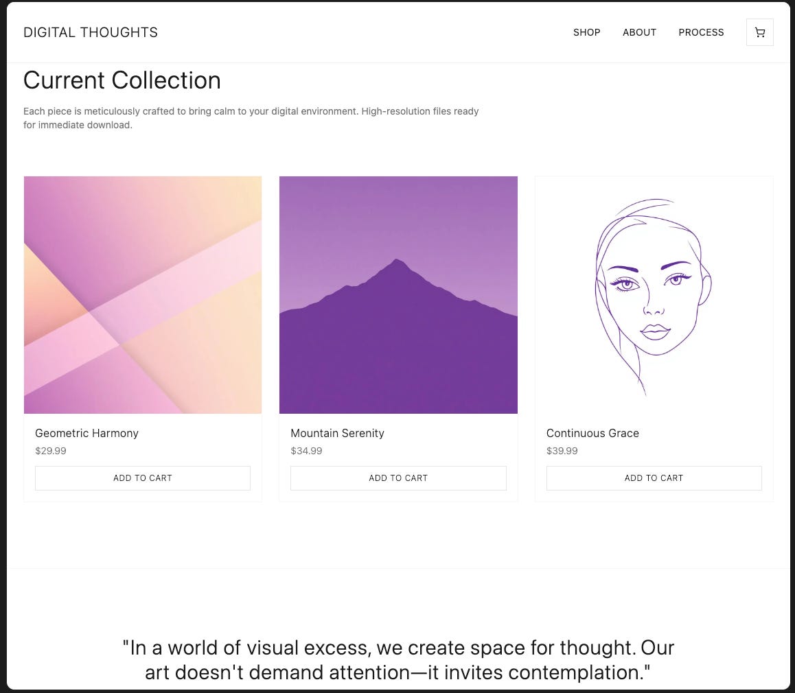 “Create a Shopify store to sell digital art in form of files (so product images has to be low quality or watermarked). Store should be named: ‘Digital Thoughts Store’.”