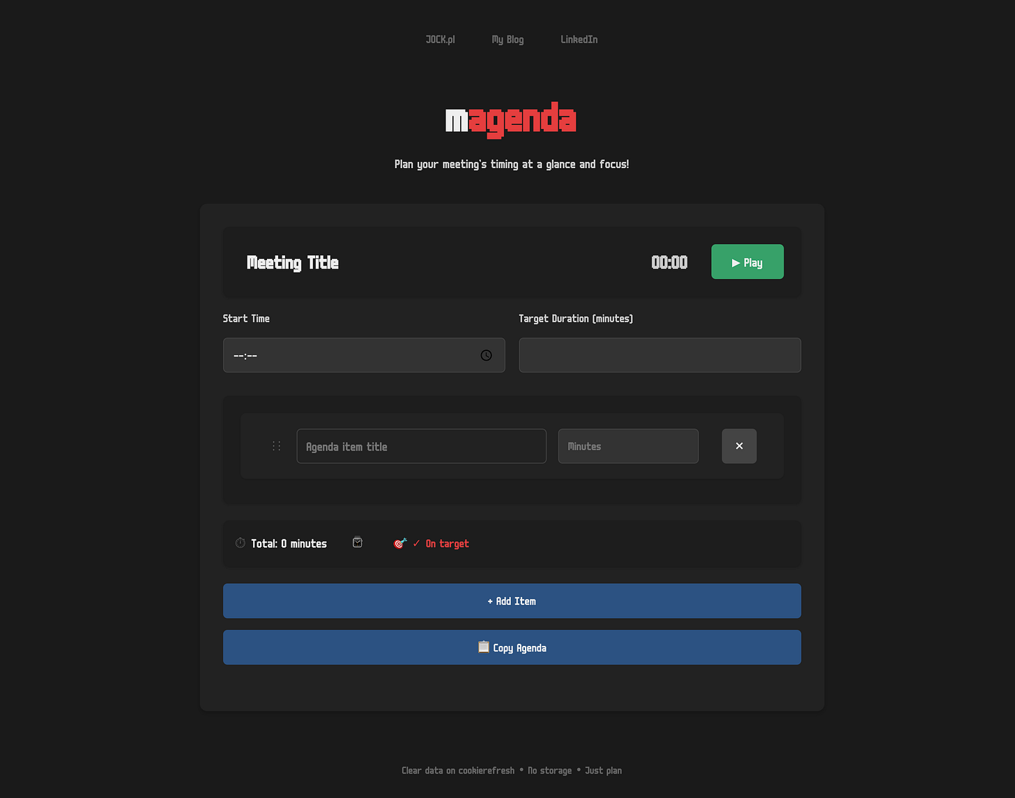 Everything stays in your browser. No accounts, no sign-ups, no "please verify your email" nonsense. Just open it and start using it. And yes, it saves automatically, because losing your carefully planned agenda due to a browser refresh is just cruel.