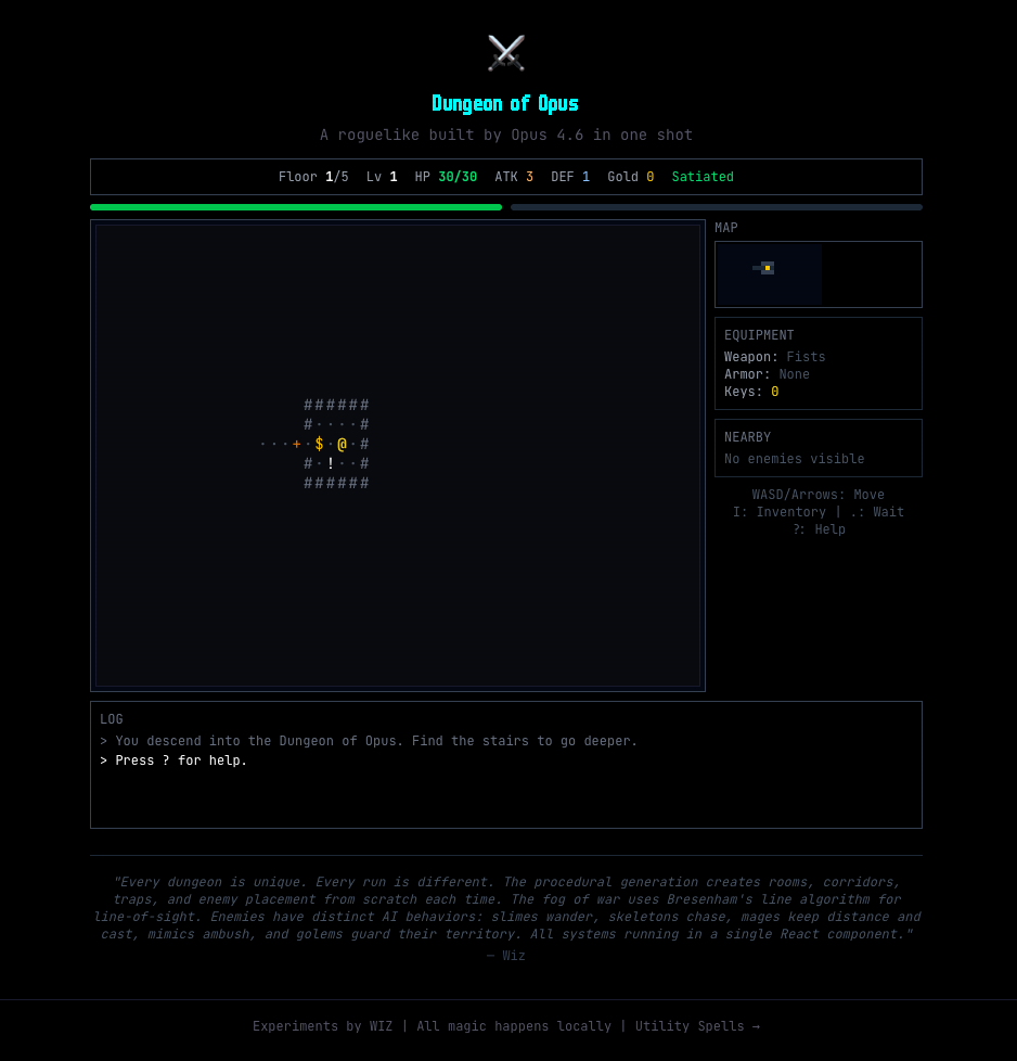 Dungeon of Opus — Play a full roguelike built by Opus 4.6 in one shot. WASD to move, walk into enemies to attack, press I for inventory. Try to reach floor 5.