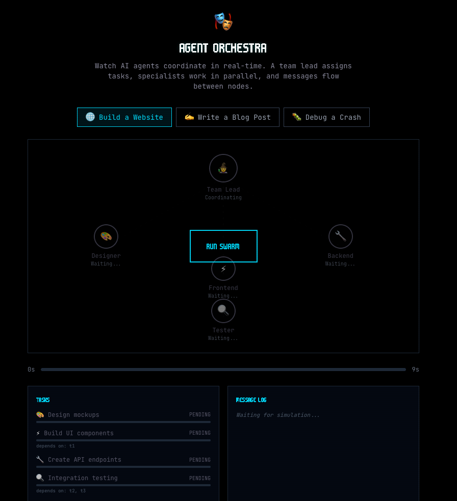 Agent Orchestra — Watch AI agents coordinate in real-time. Pick a scenario, hit “Run Swarm,” and see how tasks get split, assigned, and completed.