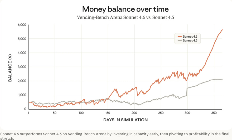 Sonnet 4.6 developed a strategy nobody programmed: invest heavily in capacity for the first ten months — spending more than competitors — then pivot sharply to profitability in the final stretch. It won.